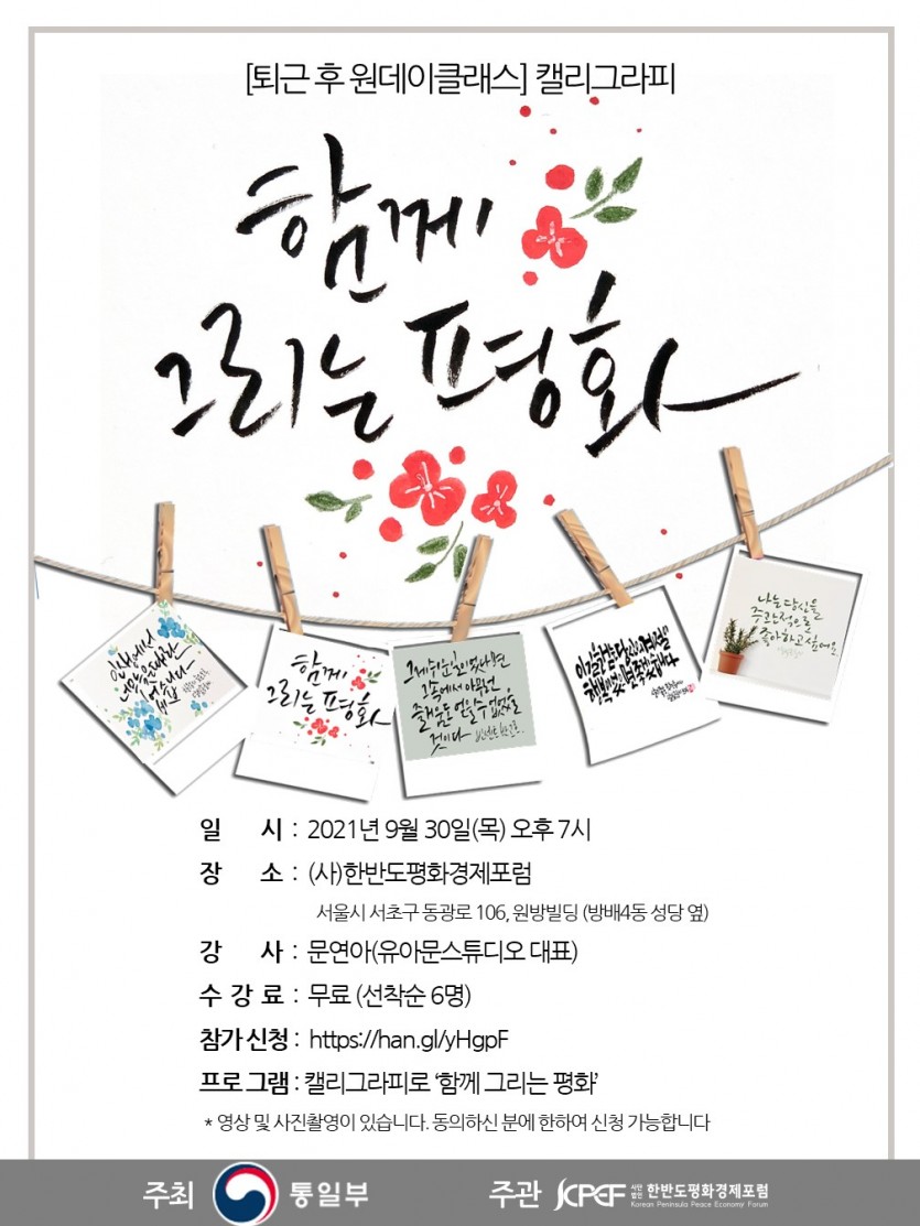 | 제목 | [원데이클래스] 캘리그라피 '함께 그리는 평화' | 작성일 | 21-09-24 09:55 |